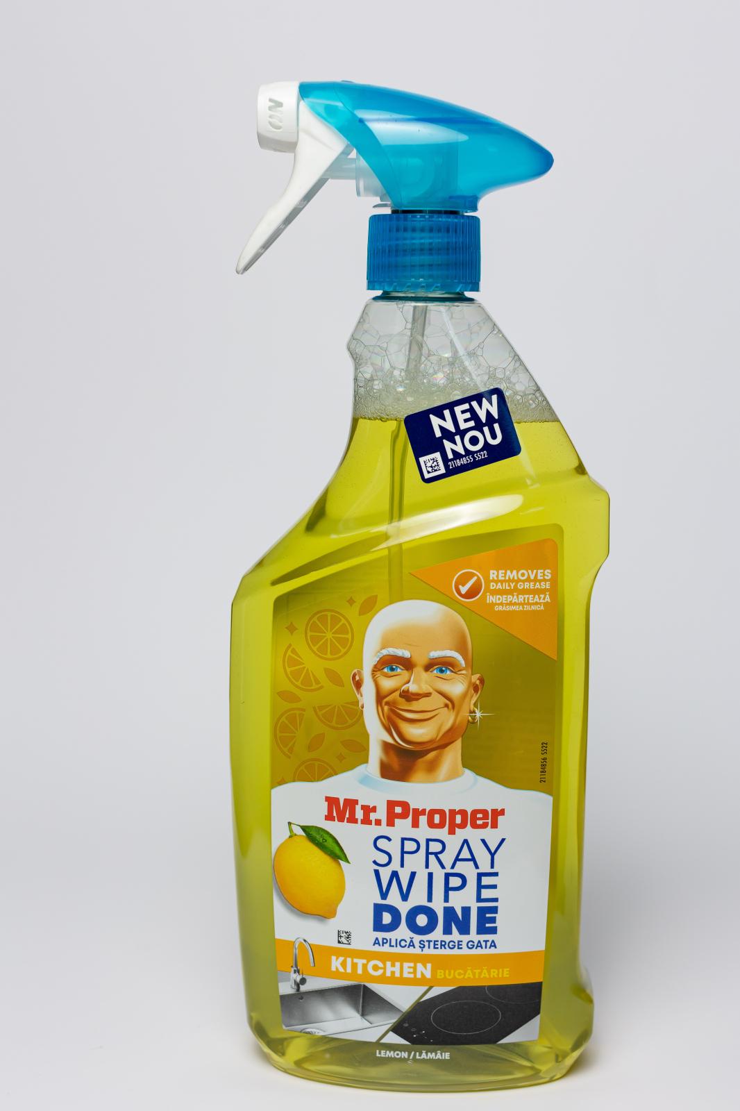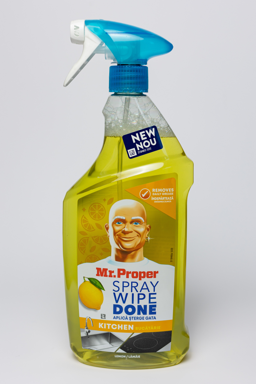 Mr Proper va schimba modul in care va curatati suprafetele. Doar pulverizati-l peste tot, stergeti-l si ati terminat deja. Este atat de simplu. Indeparteaza instantaneu grasimea de pe suprafetele tale, fara pasi suplimentari - fara spalare, fara dungi. Nu lasa nimic in urma decat o stralucire curata si stralucitoare datorita ingredientului sau pe baza de plante (82% din totalul agentilor tensioactivi, care sunt supusi procesarii). Este sigur pentru suprafetele in contact cu alimentele si nu lasa reziduuri dure. Disponibil cu un parfum uimitor de lamaie. O clatire este necesara pentru suprafetele in contact direct cu alimentele.ATENTIONARE:Nu inspirati spray-ul. A nu se lasa la indemana copiilor. A se evita contactul cu ochii. In cazul contactului cu ochii, spalati imediat cu multa apa si consultati medicul. Clatiti mainile dupa utilizare.